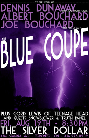 Blue Coupe comprises the long awaited reunion of Albert and Joe Bouchard, founding members of Blue Öyster Cult, on drums and guitar respectively, and Rock and Roll Hall of Fame nominee, Dennis Dunaway, founder of the Alice Cooper Group, on bass. www.bluecoupeband.com